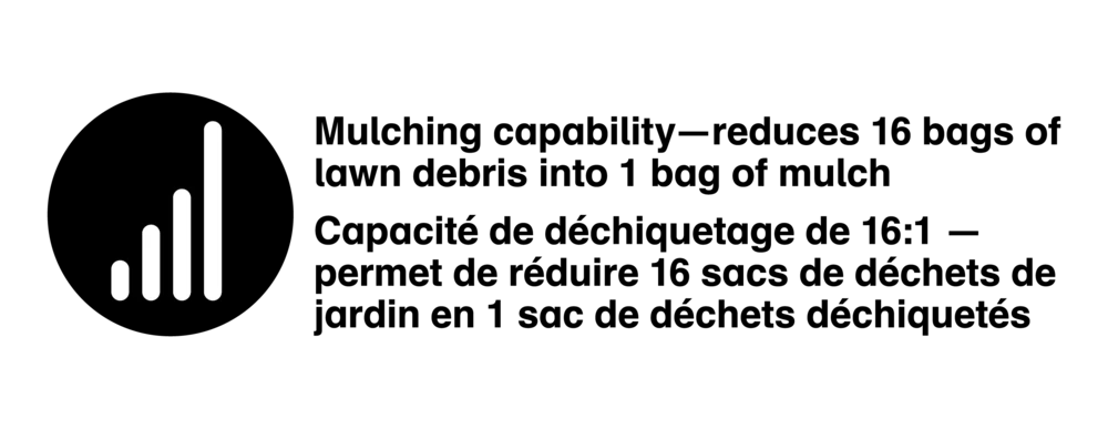 - Metal impeller with a 16:1 mulch ratio â 16 bags of yard debris into one bag