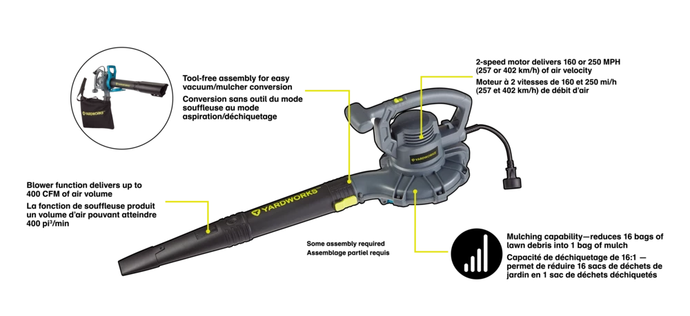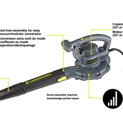 - Yardworks 12A 400 CFM Electric Leaf Blower/Vacuum provides 400 CFM of clearing power