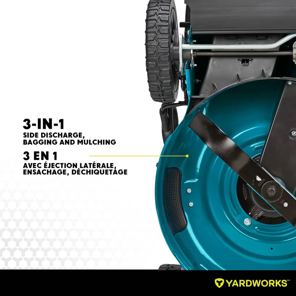- Yardworks 174cc 3-in-1 Push Lawn Mower is powered by a 174cc OHV engine and is ideal for medium-sized properties