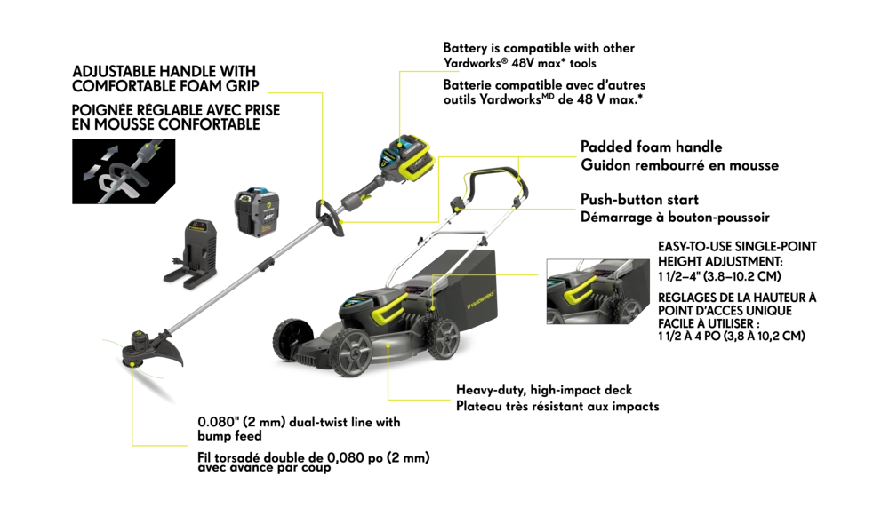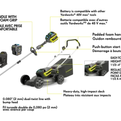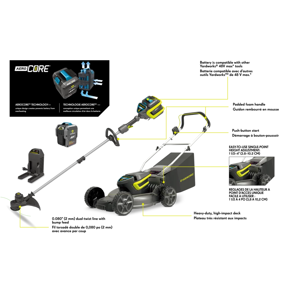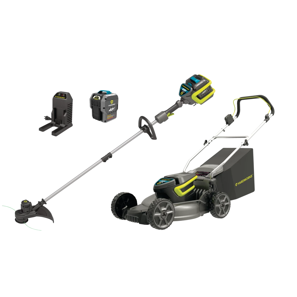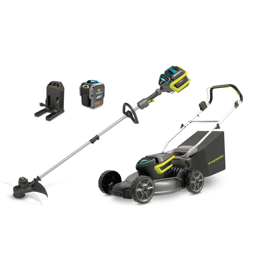 - Yardworks 48V 2-in-1 Lawn Mower and Trimmer Combo is part of Yardworks 48V ecosystem that utilizes the same battery for multiple tools