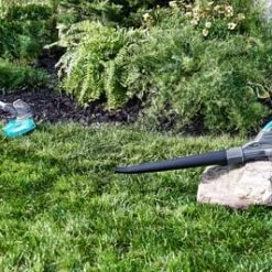 - Battery is interchangeable between both Grass Trimmer and Blower/Sweeper allowing you to easily to trim your grass and then sweep the clippings