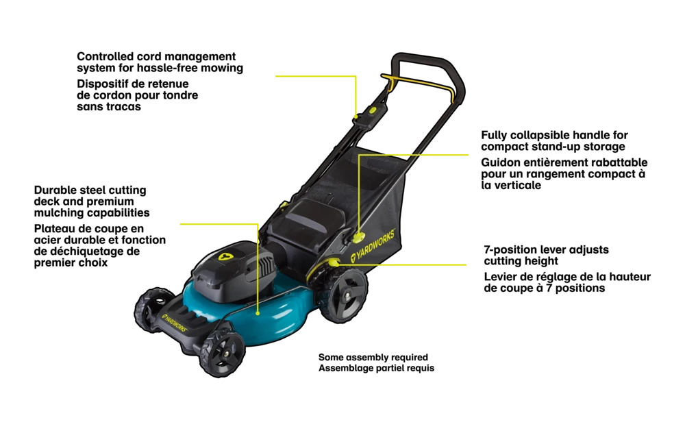 - Related or Replacement SKU’s sold separately: Mastercraft Outdoor Extension Cord (CT# 052-2309); Yardworks Replacement Mower Blade, 20″ (CT# 060-0743)