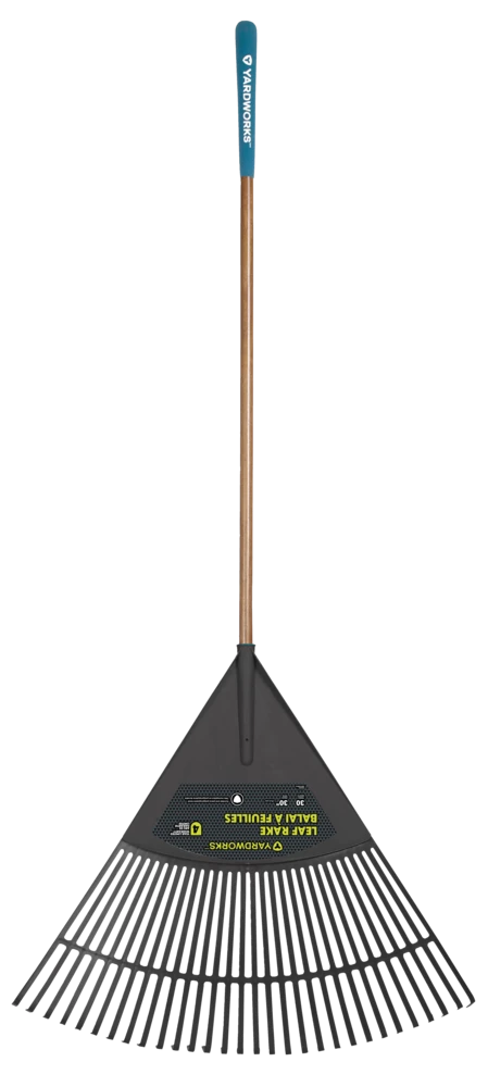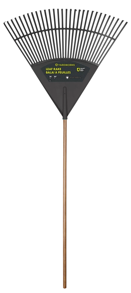 - Yardworks Leaf Rake is a 30″ (76 cm) one-piece rake that features a poly construction