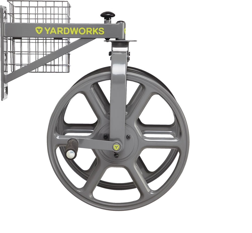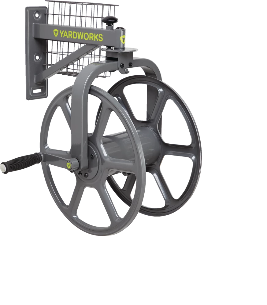 - Yardworks 360° Swivel Hose Reel features a stylish steel construction with a powder coated rust resistant finish
