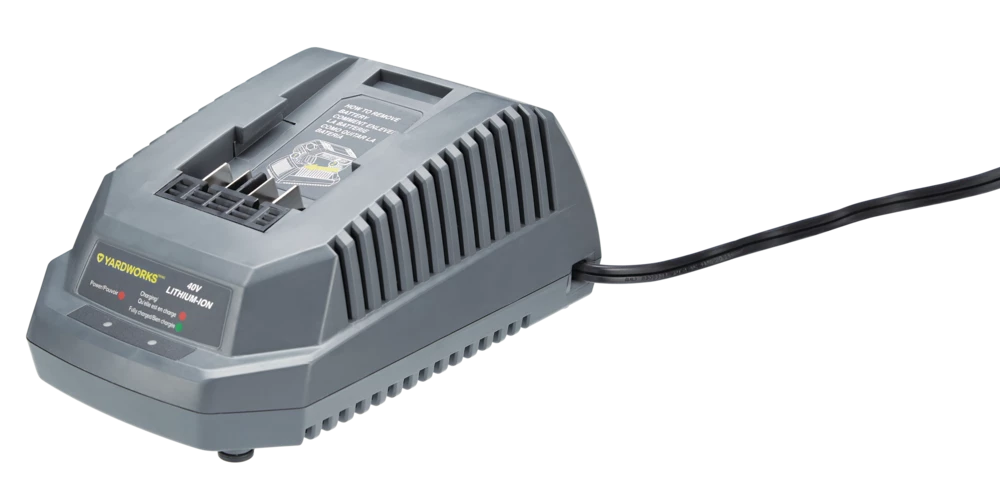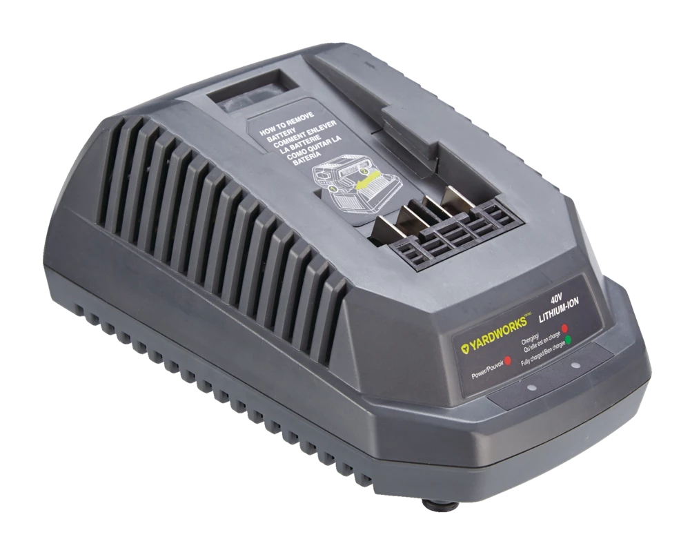 - Yardworks 40V Battery Charger will recharge any 40V yardwork compatible battery at 3 amps an hour in 90 minutes