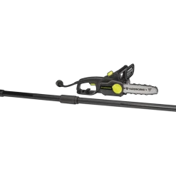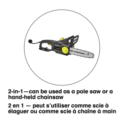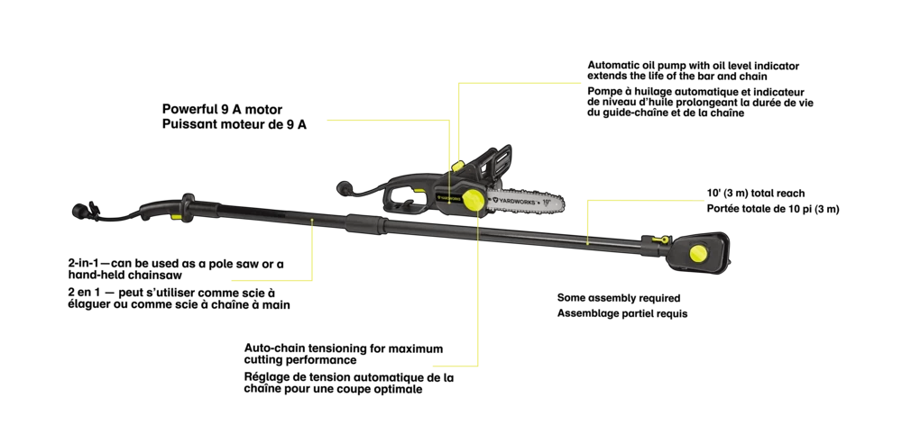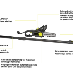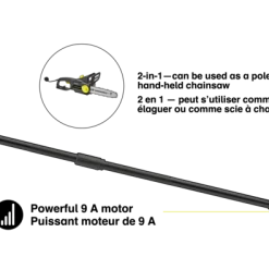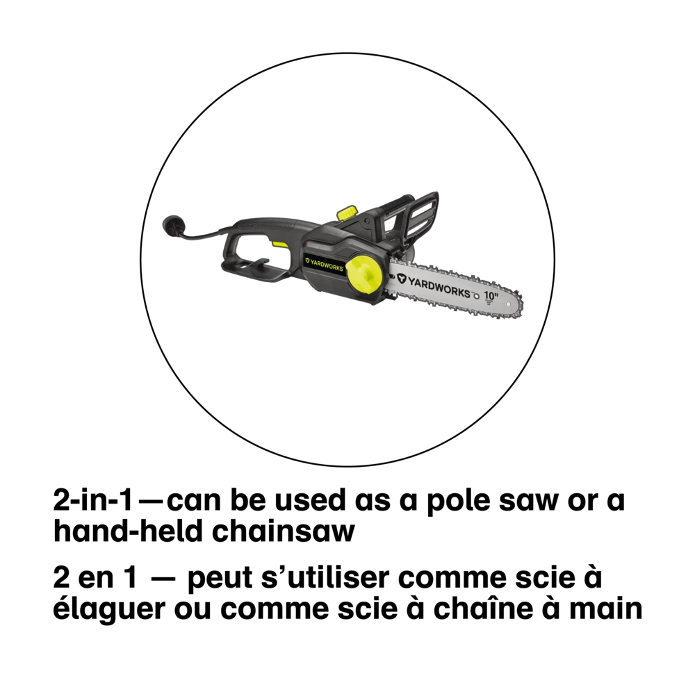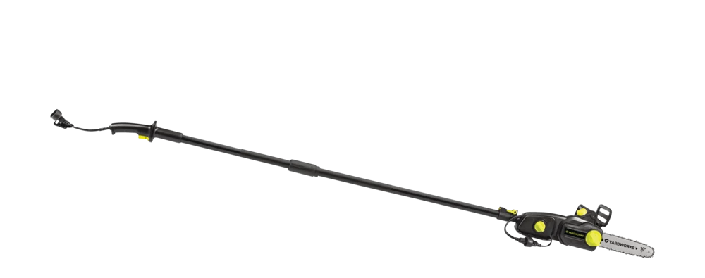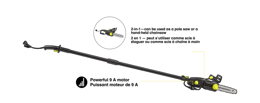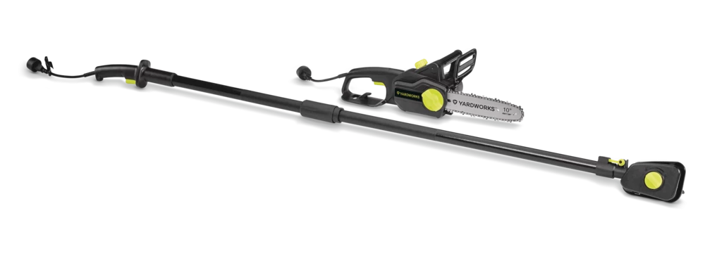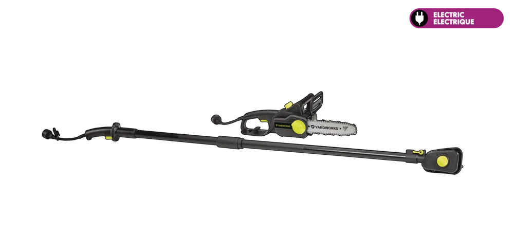 - Yardworks 9A 2-in-1 Electric Pole Saw features a 10″ (25.4 cm) bar and chain