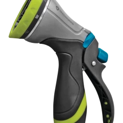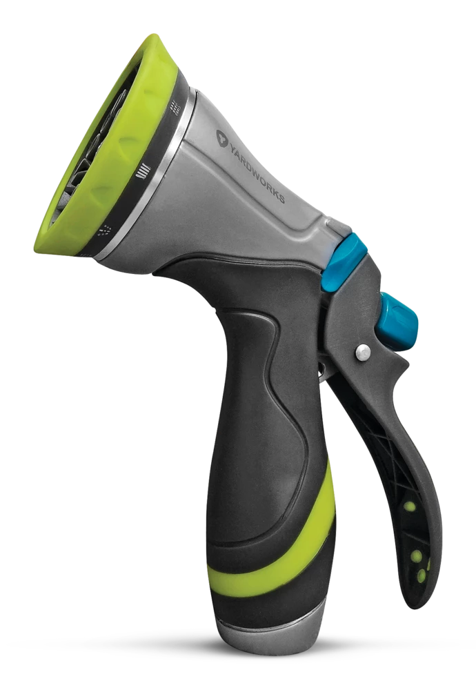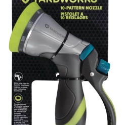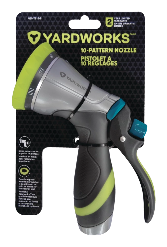 - Yardworks 10-Pattern Rear Trigger Watering Nozzle is constructed from aluminum alloy, allowing for maximum toughness and durability