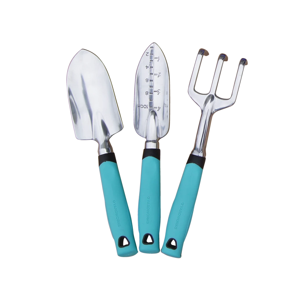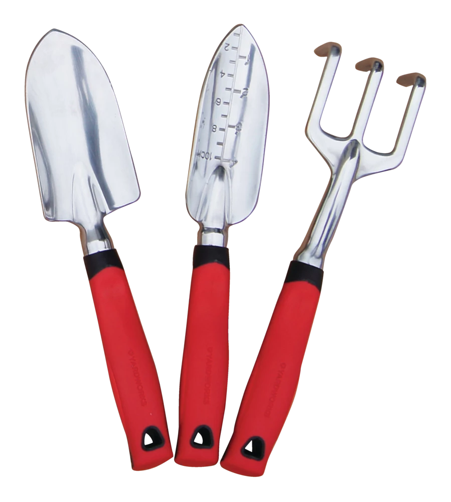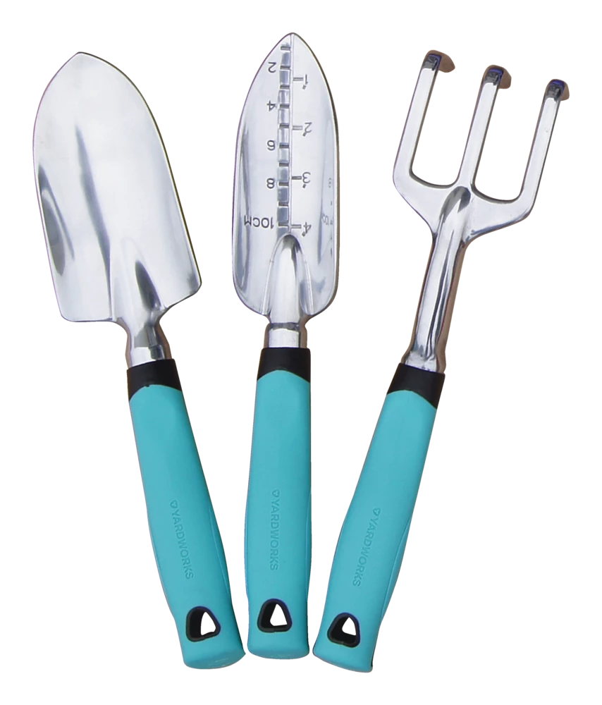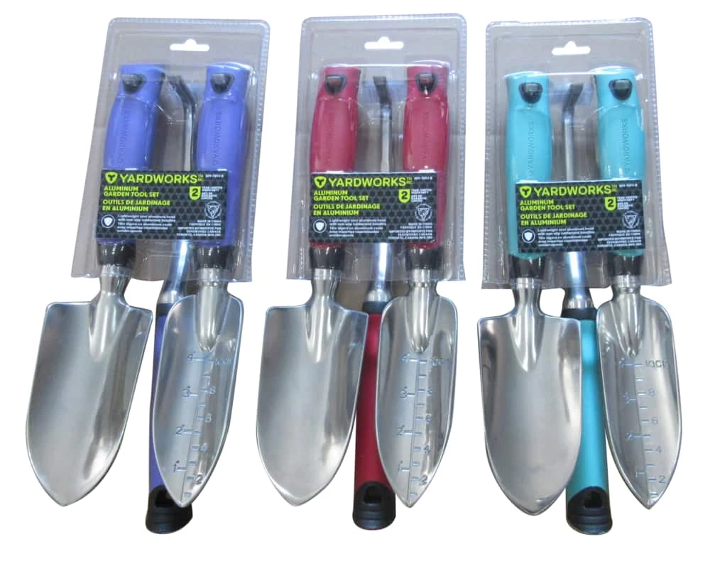 - Yardworks Colour Aluminum Garden Tool Set features a trowel, transplanter and a cultivator in a blister pack
