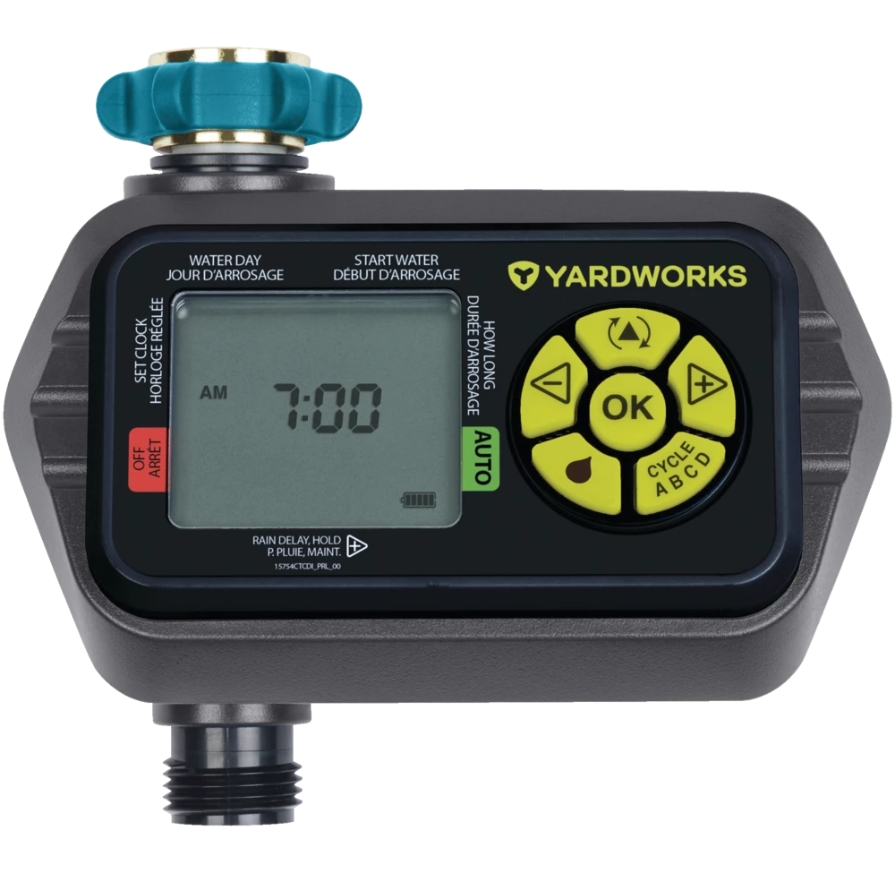 - Yardworks Dry Seal 1-Zone Digital Water Timer provides hydrologic programming for individual days of the week