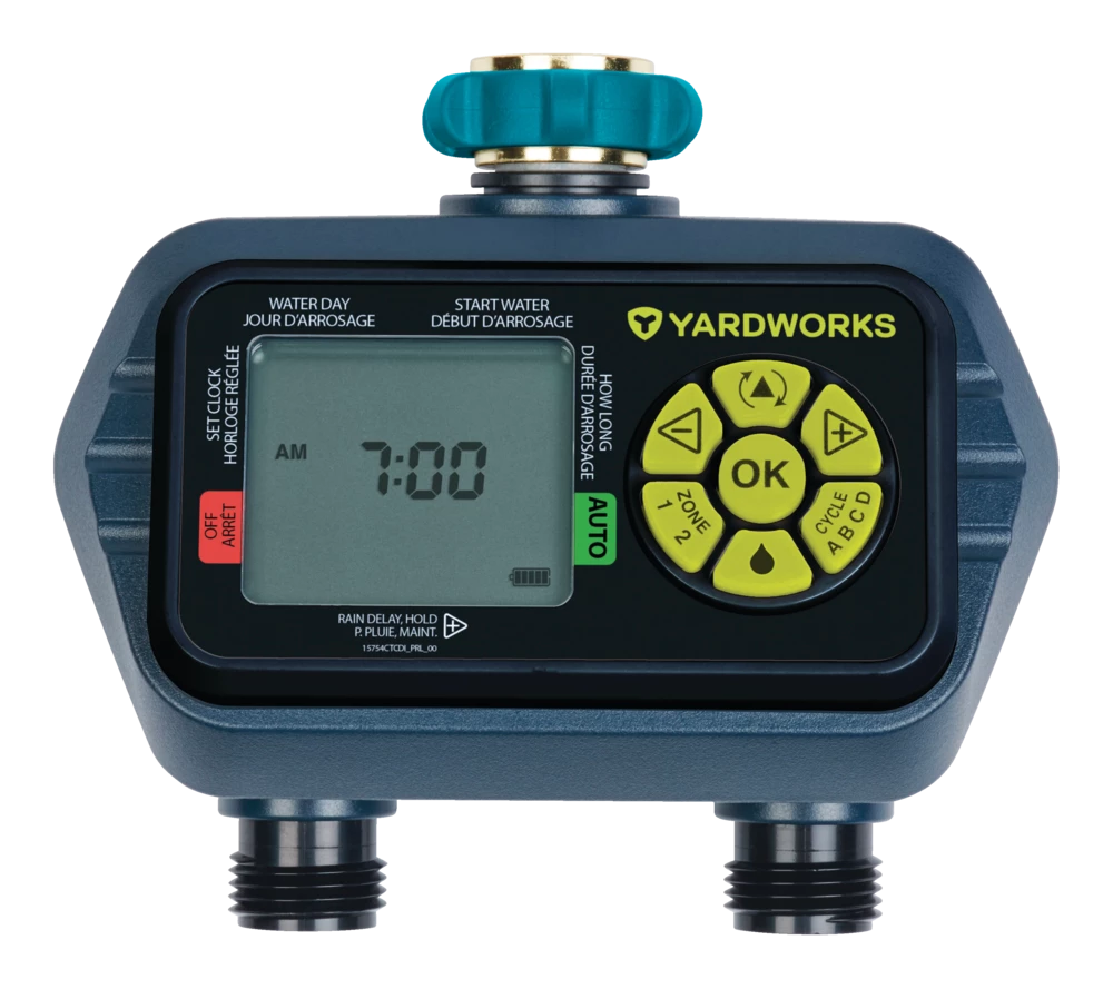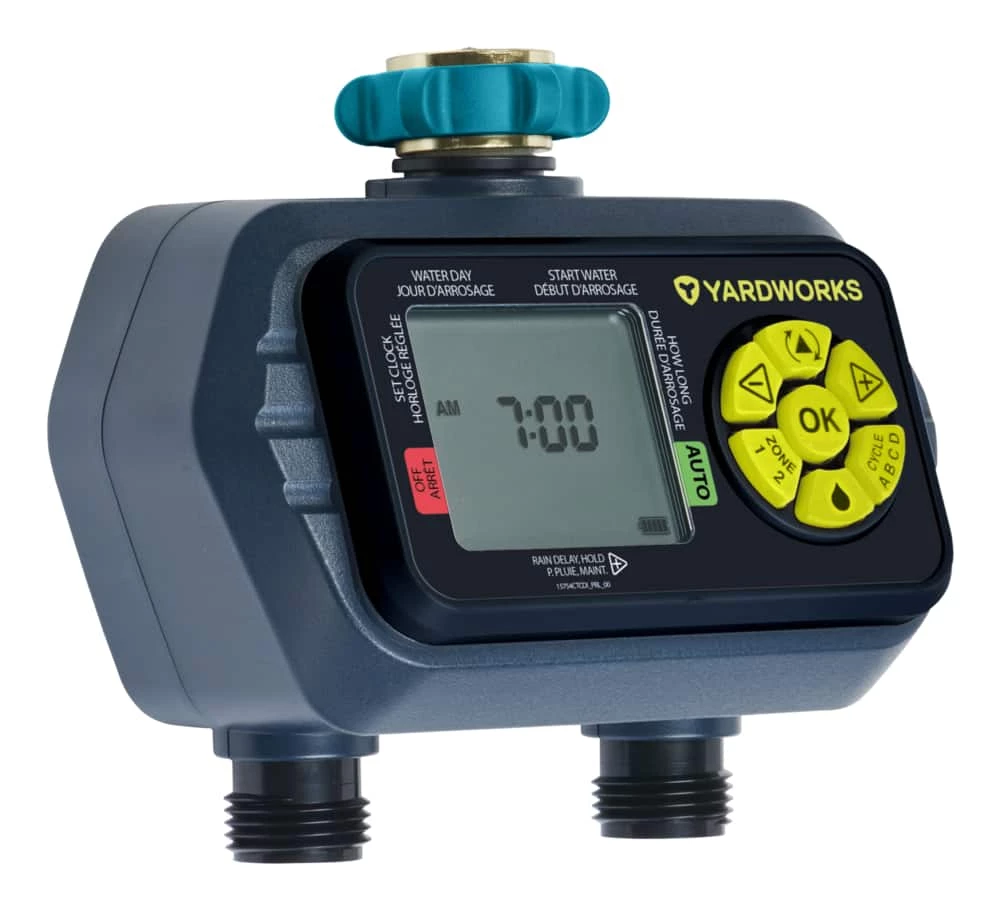 - Yardworks Dry Seal 2-Zone Digital Water Timer provides hydrologic programming for individual days of the week