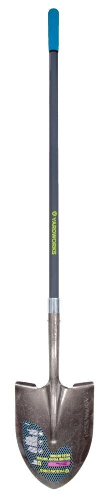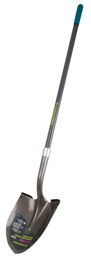 - Yardworks Fibreglass L-Handle Shovel features an ergonomic, tear drop-shaped handle with grip areas for both hands