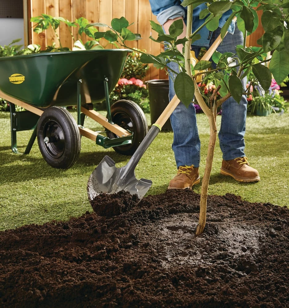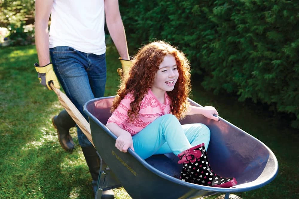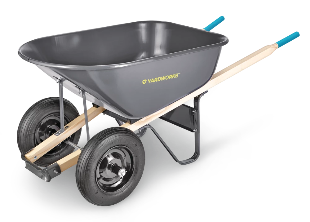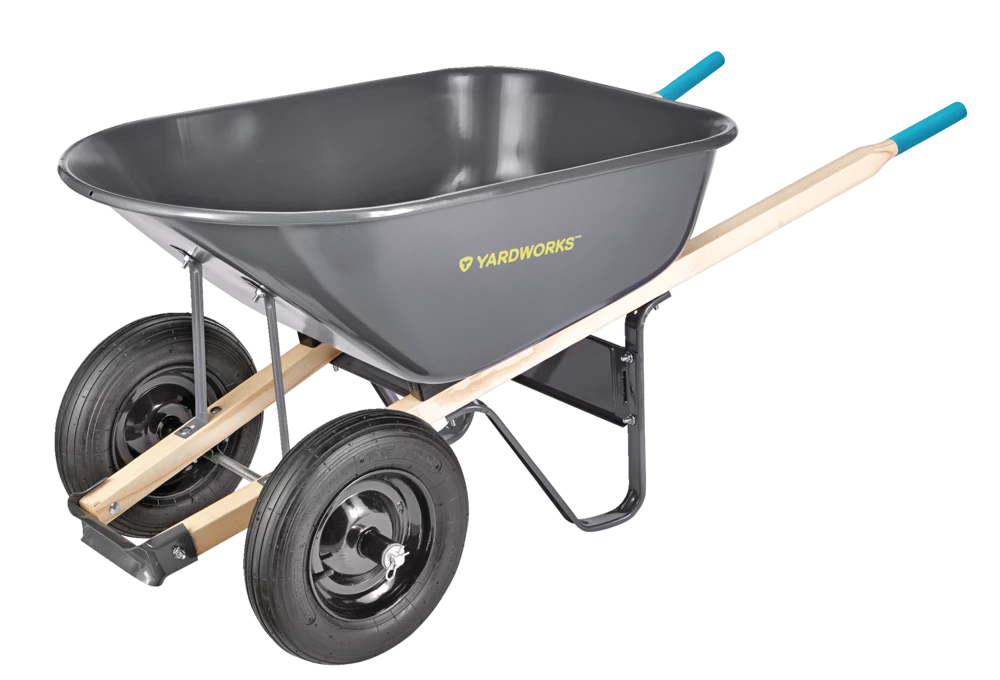 - Yardworks 2-Wheeled Wheelbarrow features an innovative two-wheel design to provide added stability and support so no need to worry about unbalanced loads again