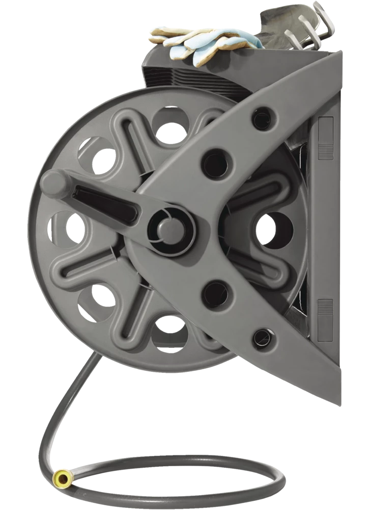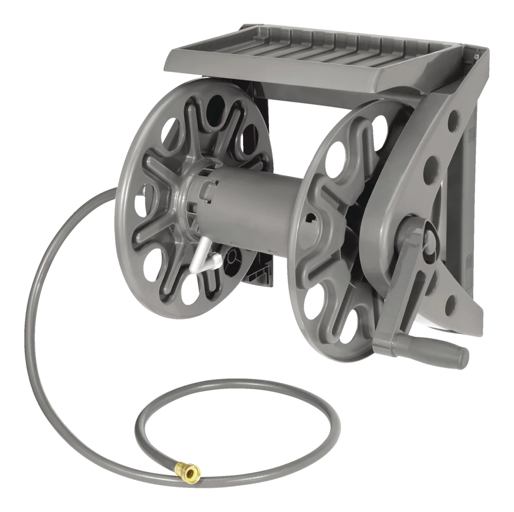 - Yardworks Wallmount Hose Reel with Shelf features a convenient shelf so you can easily place your gardening accessories